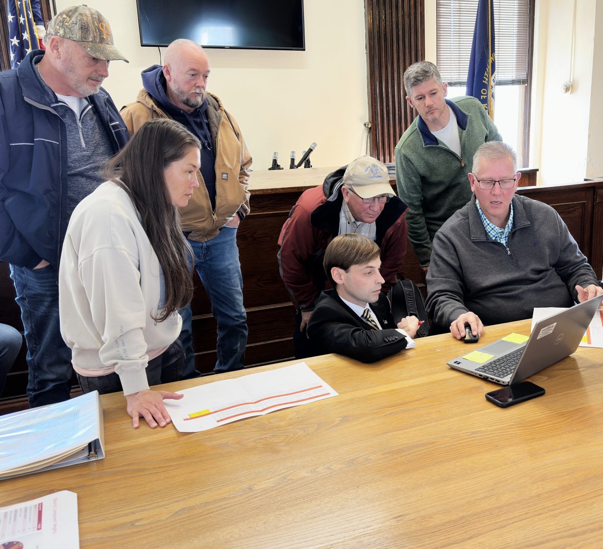 PHOTO | Greg WellsDistrict 1 Magistrate Rondall Wray, Burkesville mayor Laurel Irby and Emergency Management Director Greg Cary, left, joined County judge-Executive Luke King and District 2 Magistrate Lane Cope, kneeling and bending over, in examining the states map of proposed road work in the county. Standing at the right is District 8 Chief Engineer James Jones, and seated is Jeff Dick, who oversees planning for District 8, which includes Cumberland County.
