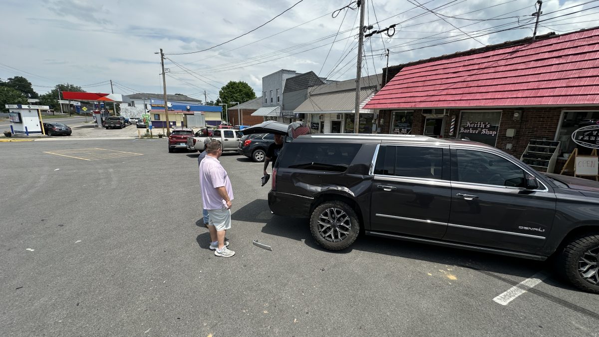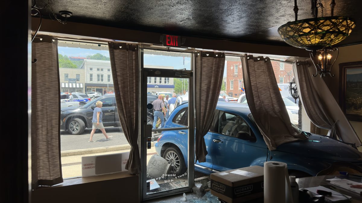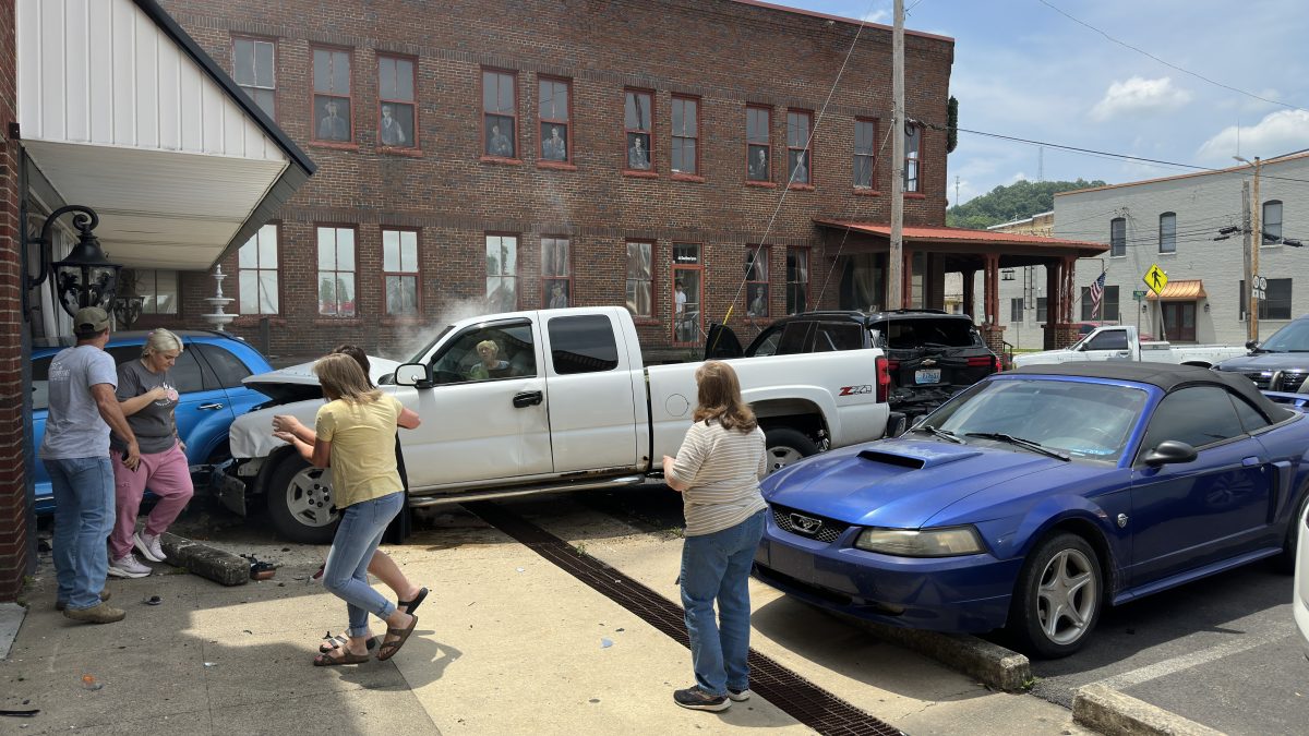 The truck proceeded to complete the circuit around the Square, passing between the two road signs on the south end and striking Lee’s SUV, then bouncing off it into a blue compact car owned by Crystal, and then pushing it into the Italian Bistro.